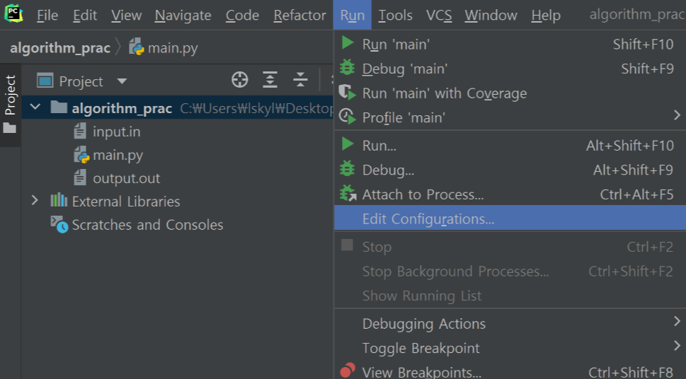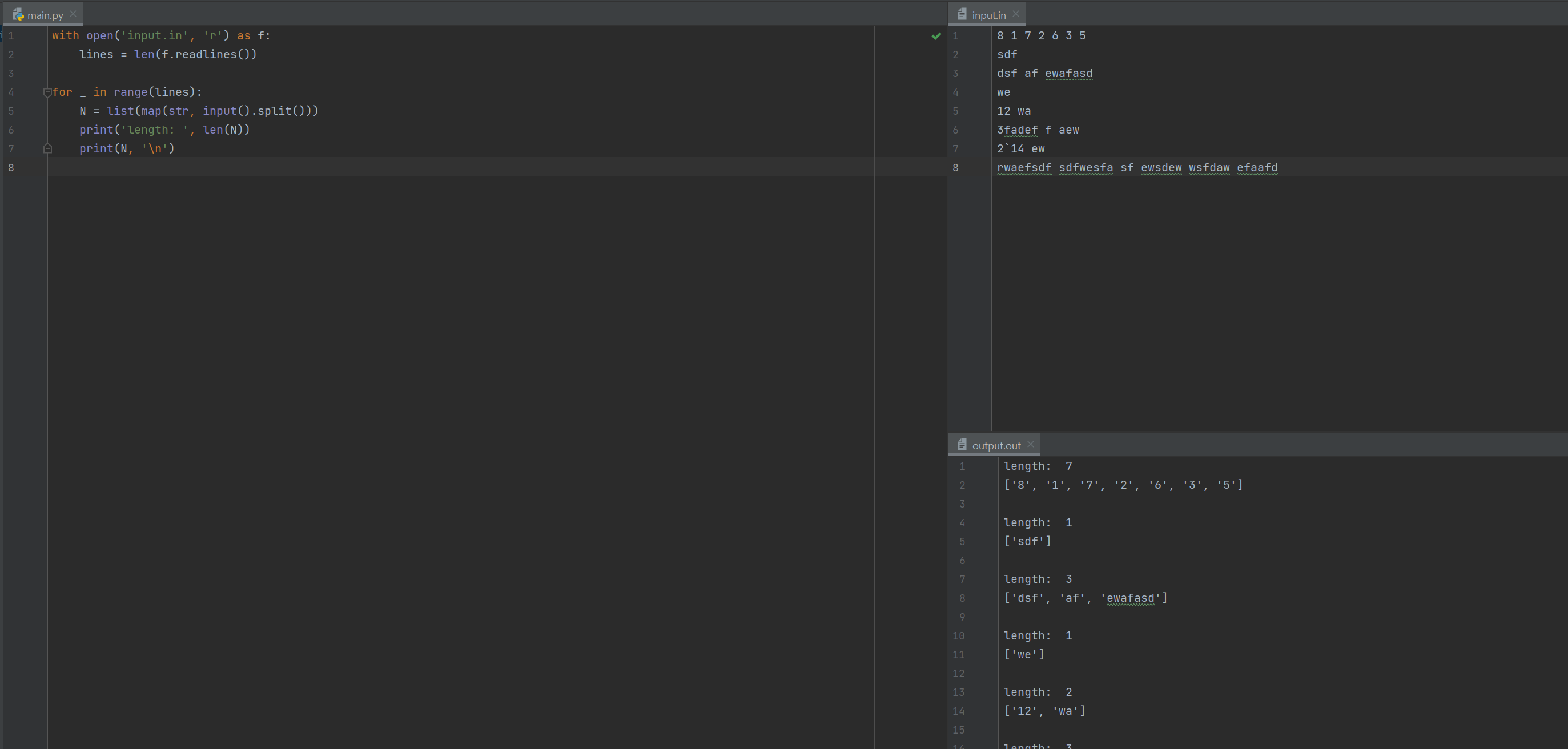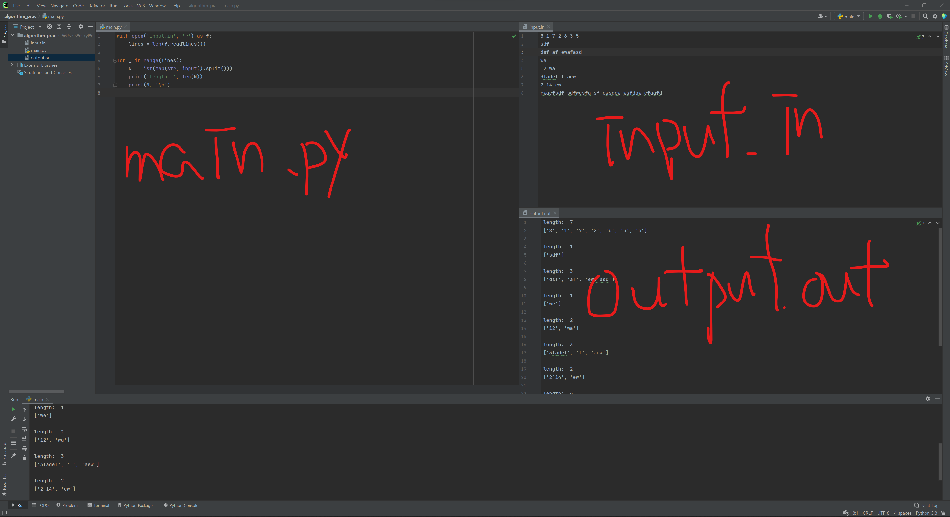 (main.py에 입력되는 input.in의 텍스트들은 'input() 함수'로 받으면 됩니다. run한 결과는 output.out에 출력되어 나타나게 됩니다.)