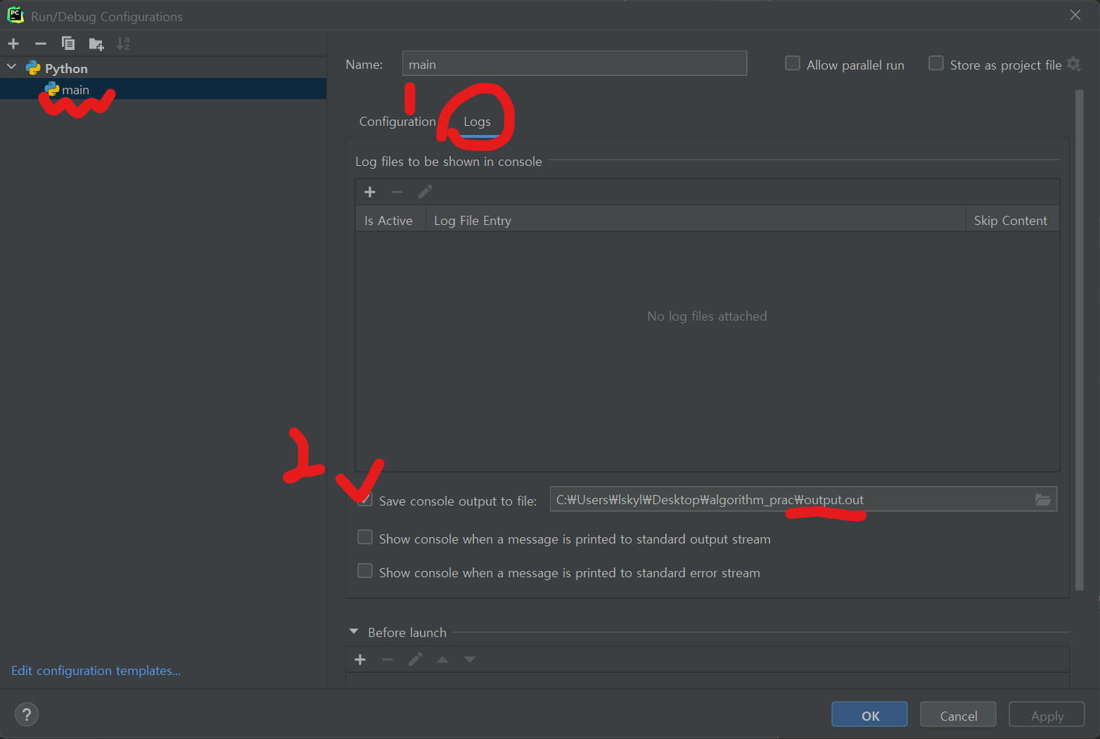 4. Logs > Save console output to file에 "output.out 파일" 위치 설정
