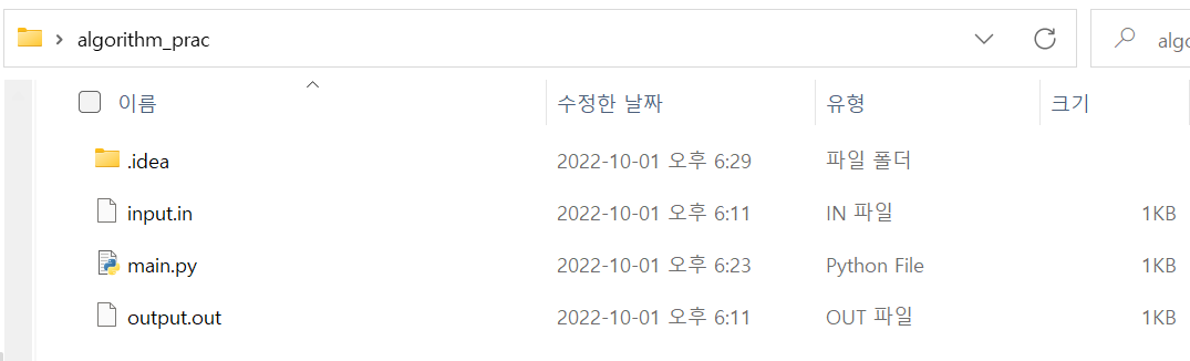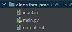 1. 먼저 input.in 파일과 output.out 파일, main.py 을 만듭니다. (확장자만 지켜주시면 됩니다)