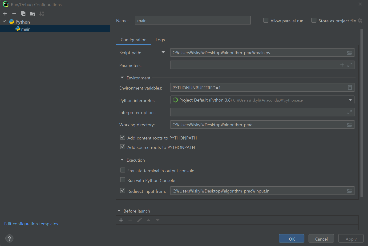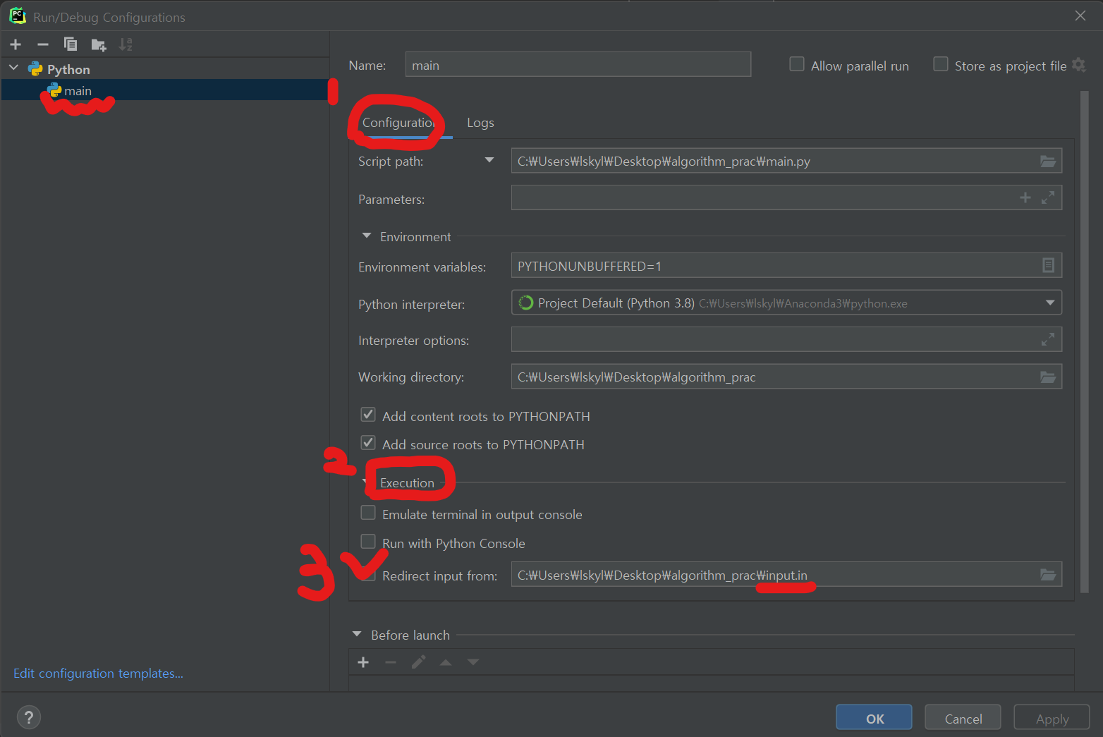 3. Configuration > Execution > Redirect input from에 "input.in 파일" 위치 설정